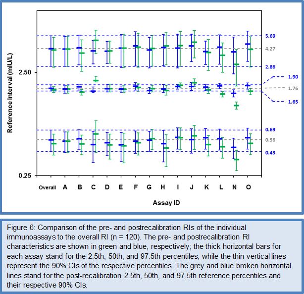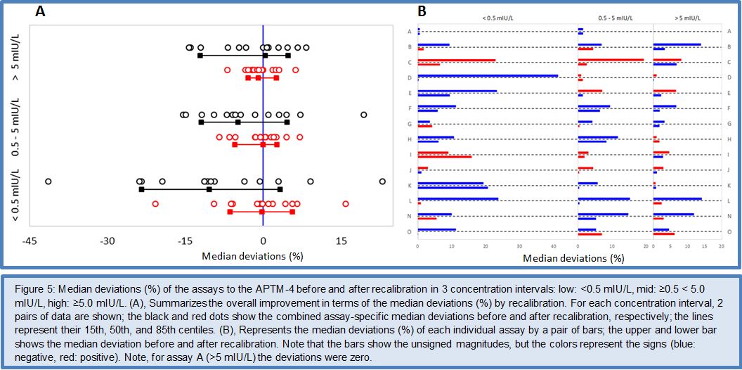 After the favorable conclusions of the Phase I to III method comparison studies on the feasibility of harmonizing TSH assays, the C-STFT consortium also proceeded for this thyroid hormone to the technical recalibration (= harmonization). This was done by conducting the Phase IV method comparison study with a unique harmonization panel comprising 101 samples from 43 eu-, 26 hypo- and 32 hyperthyroid individuals. The samples were value assigned by use of the earlier described statistical method based on robust factor analysis. The targets (for historical reasons called the all-procedure trimmed mean or APTM) then served as a basis for recalibration of the participating immunoassays, similarly as described above for FT4. To ensure the sustainability of this new calibration fixed point for TSH assays, immediately a first follow-up panel (95 samples: 36 eu-, 26 hypo-, 33 hyperthyroid subjects) with full traceability to the harmonization panel was made available. The TSH Phase IV study also investigated the proof-of-concept from measurement of a (RI) panel with the harmonized assays. Figures 5 and 6 represent the main outcome of this study. For a detailed description of the study protocol and results, we refer to (27).